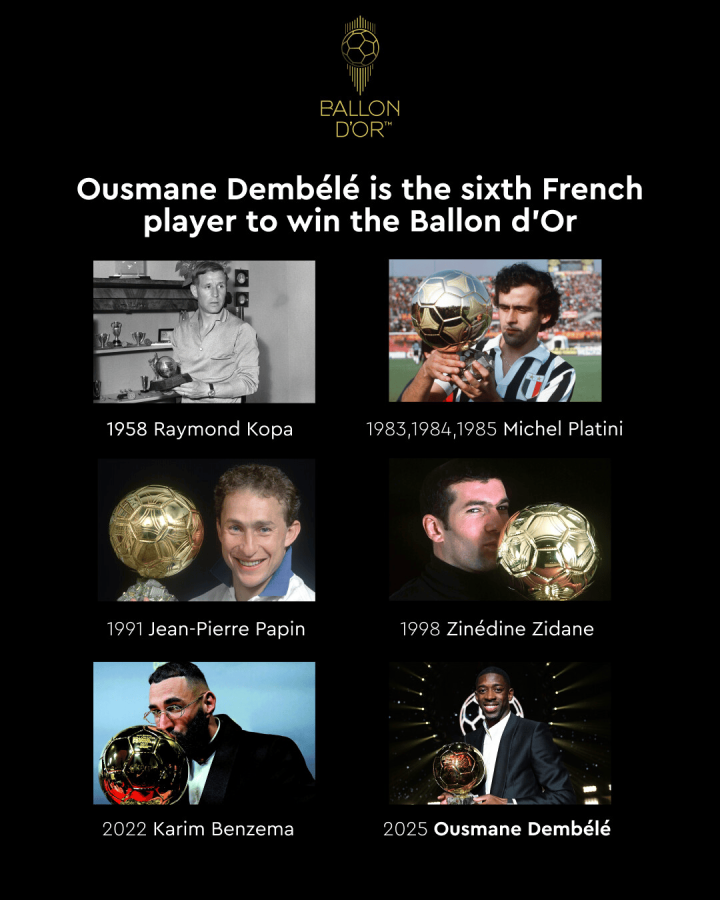 虎扑09月23日讯巴黎圣日耳曼前锋乌斯曼-登贝莱在今天领取了2025年的金球奖。