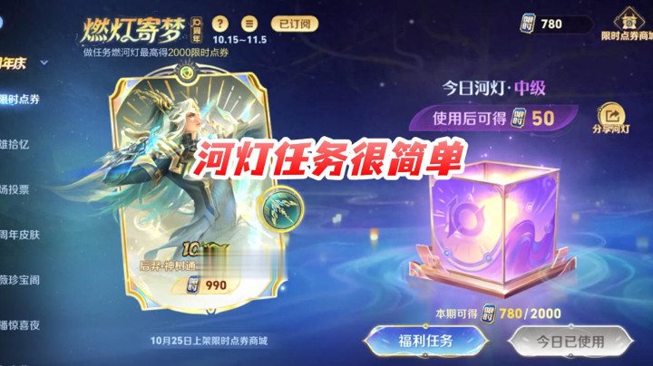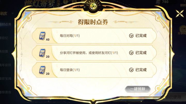 每天只要进行一场对局,然后完成分享或者使用河灯的任务,再开启河灯,就可以拿到最多160限时点券。