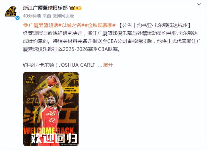 如今广厦男篮官方发布公告:“经管理层与教练组研究决定,浙江广厦篮球俱乐部与外援卡尔顿达成续约意向。待相关材料完备并报送至CBA公司审核通过后,他将正式代表浙江广厦男篮征战2025-2026赛季CBA联赛。”
