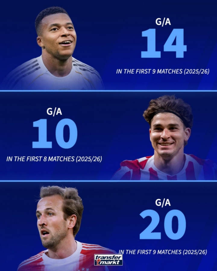 除了吹凯恩之外,也吹一吹本赛季状态同样火热的两位西甲前锋姆巴佩和阿尔瓦雷斯,其中姆巴佩9场13球1助参与进球14个,阿尔瓦雷斯8场7球3助参与进球10个。