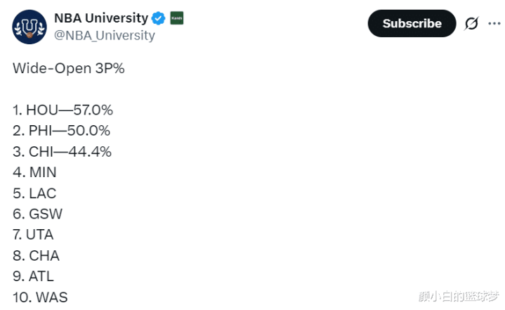 除此之外火箭队本赛季空位三分球命中率高达57%联盟第一,费城50%第二。