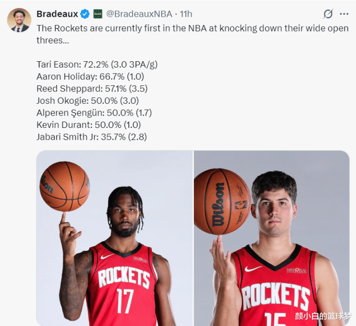 本赛季空位三分球命中率:伊森70%、霍勒迪66.7%、谢泼德57.1%、奥科吉50%、申京50%、杜兰特50%。小贾35.7%。