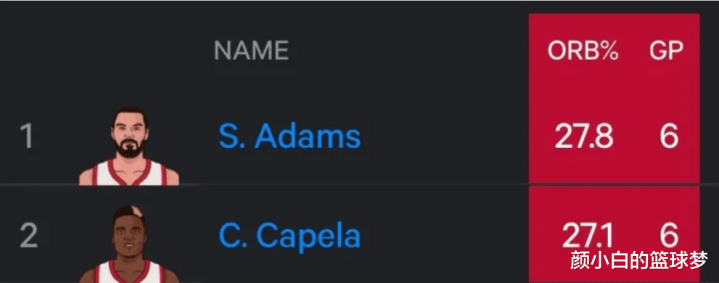火箭的替补也很强,目前亚当斯的前场篮板率27.8%联盟第一,卡佩拉的前场篮板率27.1%联盟第二,火箭队场均14.3个前场篮板联盟第三,总篮板49.3个联盟第二,这就是火箭最擅长的投抢!