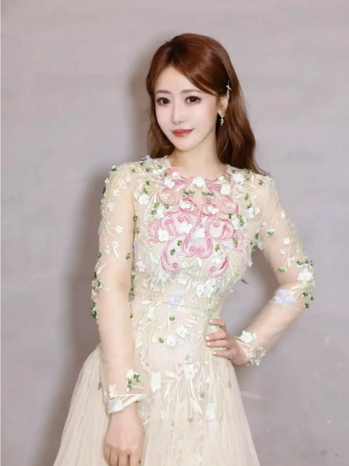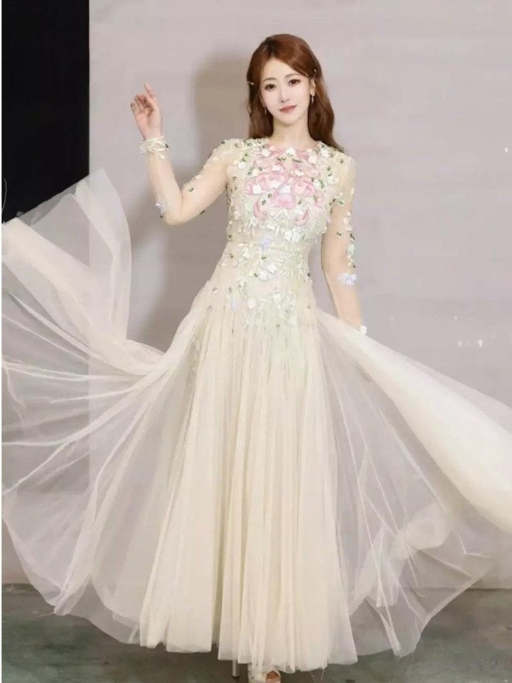 这款繁花纱裙出自高端定制品牌的匠心设计,耗费近千工时打造而成。裙身采用三层进口欧根纱叠加,外层的透明薄纱上,匠人以苏绣工艺绣出牡丹、蔷薇与铃兰等十余种花卉,每一片花瓣都由丝线层层堆叠出立体肌理,在灯光下泛着细腻的珠光。腰部的鱼骨收腰设计精准勾勒出陈紫函纤细的腰线,让她的身形在纱裙的蓬松感中更显窈窕,而裙摆处的不规则剪裁,使得行走时纱裙如花瓣般舒展,仿佛有蝴蝶绕身飞舞。造型团队为她搭配了简约的珍珠耳饰,未做过多配饰堆砌,让繁花纱裙成为视觉核心,恰好契合了“花仙子”的灵动与纯粹。